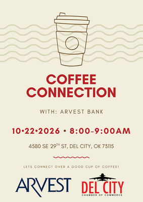 Come join us for our October 4th Thursday Coffee Connection with Arvest Bank in Del City! This will be a great opportunity to meet with them, Board members, and other Chamber members.
