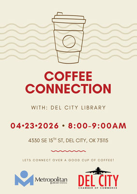 Join us for our 4th Thursday in April Coffee Connection with the Del City Library! This will be a great opportunity to meet with them, Board members, and other Chamber members.